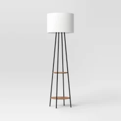 Light up your living room or dining area with this Floor Lamp with Shelves from Room Essentials™. This floor lamp features a cylindrical shade and a black metal body for a stylish look, and features two-tiered shelves that can be used to display photographs and other decorative accents. The white linen shade brightens up your space with a soft glow, while the one-way light setting with a rotary-socket switch allows for easy operation.