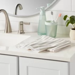 Style your bath space with this Quick-Dry Striped Waffle Towel from Room Essentials™. Boasting an allover striped pattern for cool flair, this waffle towel mixes easily with your existing decor style and color palette. The waffle towel is made from quick-drying fabric that’s great for wiping hands or cleaning up spills, and it’s also fade resistant so the color stays looking fresh through countless washes. Plus, the towel also features a top loop for easy hanging from a hook in your bathroom.